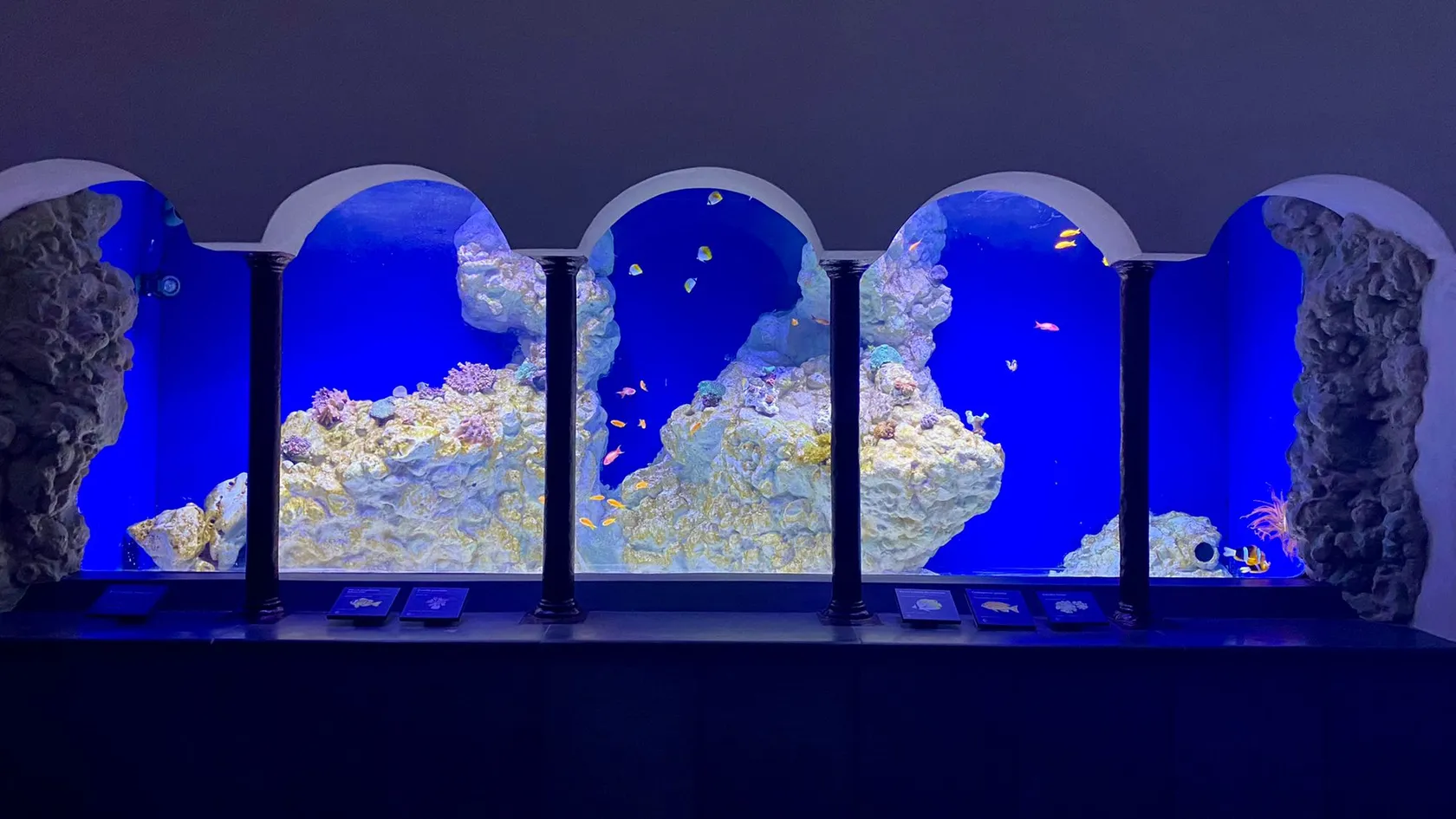 A unique example of a nineteenth-century aquarium. It was opened on 12 January, 1874. Apparently, it is the oldest of the currently operating marine public aquariums in Europe. The aquarium attracts numerous visitors every year, including tour groups of schoolchildren and tourists. The exhibition includes 23 aquariums with volumes ranging from 250 to 60,000 litres and a total volume of 246,000 litres. They are lined with volcanic stone to simulate a natural setting. The aquariums are lit mainly by natural sunlight through special openings in the ceiling to enhance the naturalness. About 200 species of fish from the Gulf of Naples are exhibited here, including about 100 species of fish. Not only common, but also rare and difficult to keep species are exhibited. The so-called semi-closed system of water quality maintenance is used. The water intake is located in the sea 300 metres from the shore at a depth of 11 metres. The water stands in a large tank and then is pumped into two large underground systems and then into the exhibit aquariums. About one third of the total water volume is changed. Visitors can get booklets describing the Public Aquarium in five languages. Each aquarium has illuminated information panels.