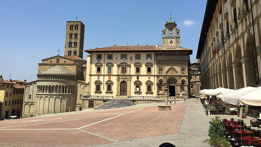 Piazza Grande (Great Square) – the heart of Arezzo, a beautiful medieval square surrounded by historic buildings. The north side is occupied by a palace by Vasari, the Palazzo delle Logge, with an elegant colonnade. The bell tower was added by Giorgio Vasari in the 16th century. It houses one of the oldest Italian working clocks.