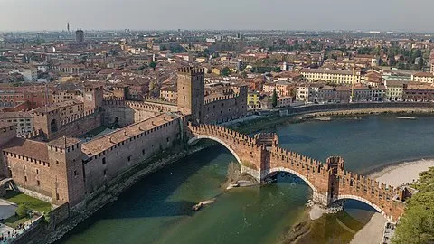 The Scaliger Bridge connects Castalvecchio with the left bank of Verona. They were built at the same time, in Romanesque style, and together represent a magnificent ensemble of medieval architecture. The Scaliger Bridge, adjacent to the castle, is named in honor of the Scaliger dynasty that ruled at that time. By order of the monarch Cangrande II dela Scala it was designed by the famous architect of the Middle Ages Guglielmo Bevilacqua. He also supervised all the works. The construction lasted more than 10 years and ended in 1355. The bridge became the only road connecting Castalvecchio with the city. It is a very powerful and at the same time aesthetic structure, with the same loopholes and pointed teeth as the castle, its length is more than 100 meters. It consists of three arches of different lengths, which are supported by two pentagonal towers. The arches form three spans, the longest being 50 meters long. The bridge was so strong and reliable that it stood without reconstruction for about 500 years. It was blown up by the Germans during the retreat from Verona in 1945. After the war, the bridge was rebuilt in its original form, according to surviving drawings and descriptions, using fragments found in the river.