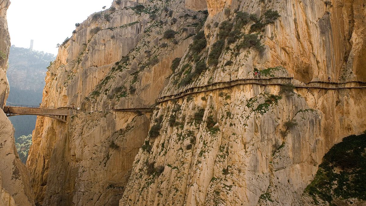 The so-called “Royal Road” is a narrow path about 1 meter wide in the gorge of El Chorro, in the Ardales Natural Park, near the Guadalorese Lakes.