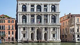 The palace was finally completed in 1575 by Giovanni Rusconi. The door portal was designed by Alessandro Vittoria.