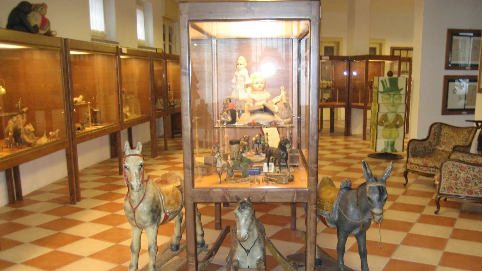Первая экспозиция посвящена истории игрушки. Более 2000 всевозможных игрушек и детских развлечений, изготовленных в разных европейских государствах в промежутке между 1770 и 1960 годами, представлено в этом зале. Все экспонаты экспозиции разделены на пять секций: для малышей, для игры в «войнушки», обучающие, цирковые и, конечно, итальянские игрушки. При этом сотрудники музея не спрятали старинные экспонаты под толстое стекло и не развесили их на стендах. Целые композиции составили из самых разных игрушек. А ещё здесь можно увидеть паровозики и множество механических экспонатов, которых регулярно заводят для увеселения посетителей.